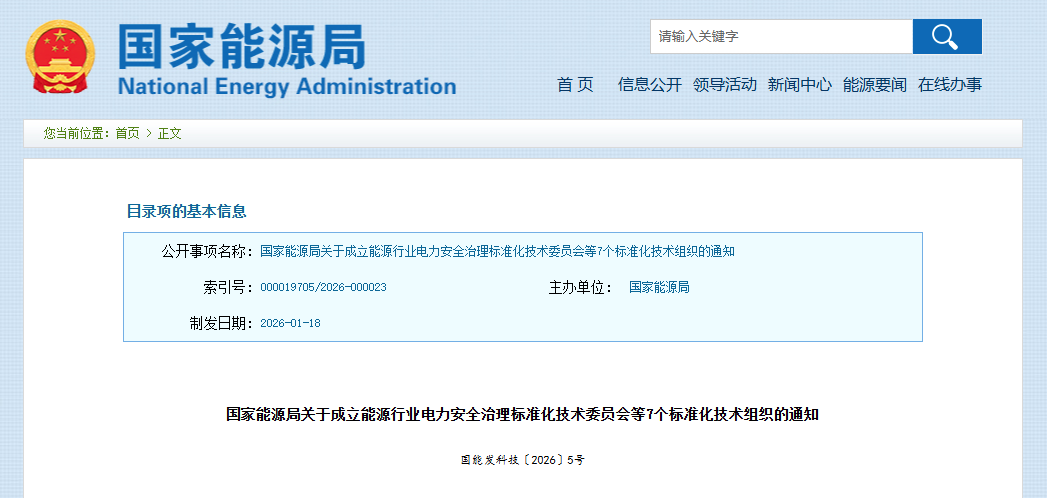 1月27日,国家能源局发布《关于成立能源行业电力安全治理标准化技术委员会等7个标准化技术组织的通知》,批准成立7个能源行业标准化技术委员会,其中:电力领域2个,碳管理领域1个,氢能领域4个。